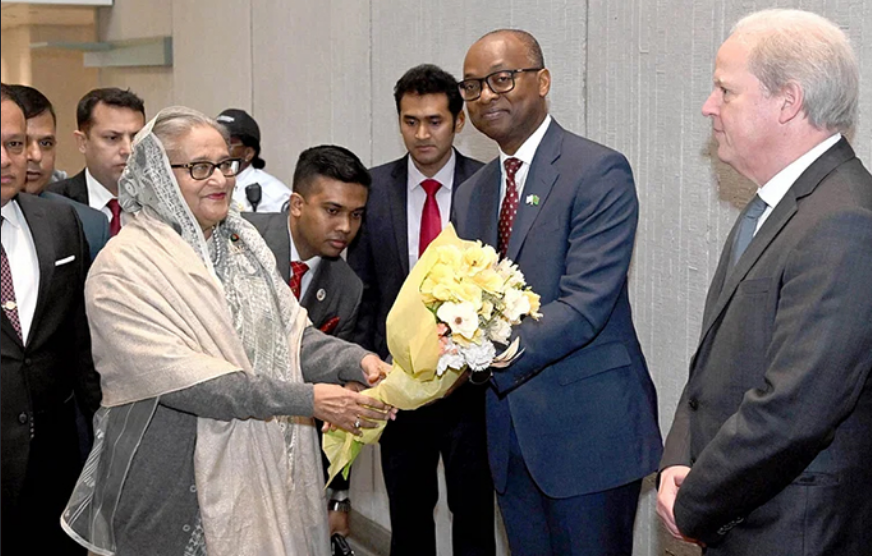 ওয়াশিংটন ডিসিতে বিশ্বব্যাংকের সদর দফতরে পৌঁছালে বাংলাদেশের প্রধানমন্ত্রীকে বাংলাদেশে বিশ্বব্যাংকের কান্ট্রি ডিরেক্টর আবদৌলায়ে সেক এবং তার এসএআর ভিপি মার্টিন রাইজার ফুলের তোড়া দিয়ে স্বাগত জানান।